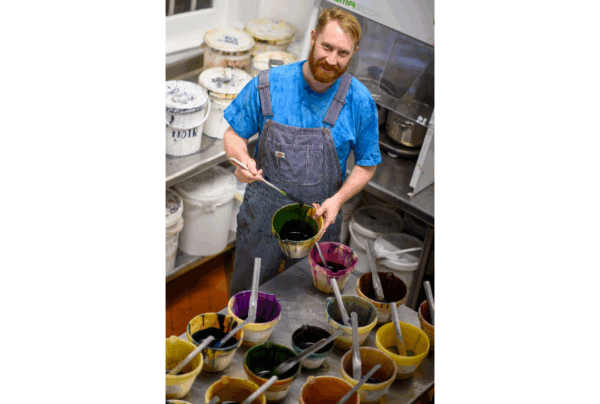 Pots de couleurs pigmentées préparées à la main pour l’impression au cadre dans l’atelier Brochier Soieries